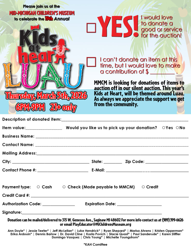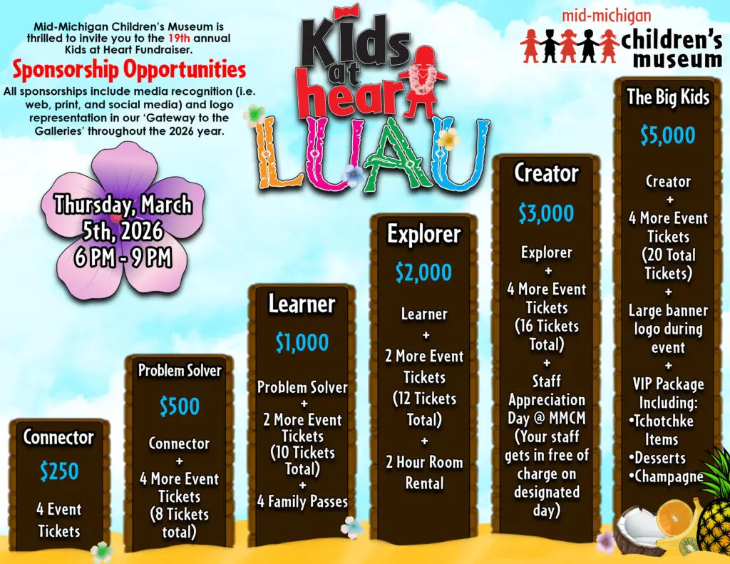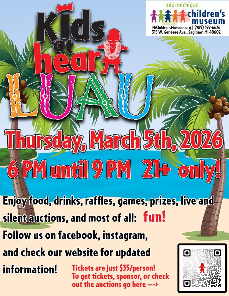 LUAU! This is our biggest fundraiser of the year! Where adults get to be kids! Come play with us from 6 pm until 9 pm and enjoy live entertainment (FrankNJude), drinks, games, raffles, prizes, great food (catered by From Scratch), and a silent and live auction! Join us for a night of fun, experience the ‘Play and Learn’ atmosphere, and get Lei’d at The Mid-Michigan Children’s Museum! General Admission tickets are just $35, or you can sponsor for extra perks per level!