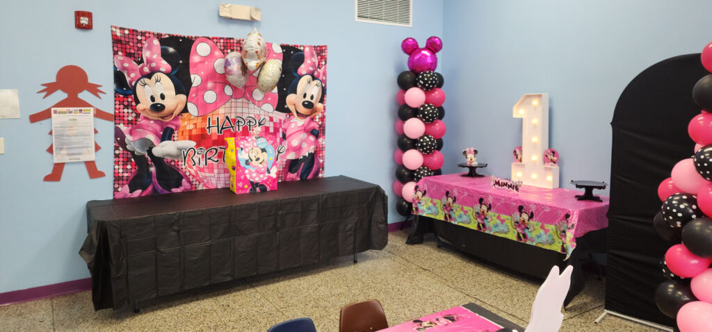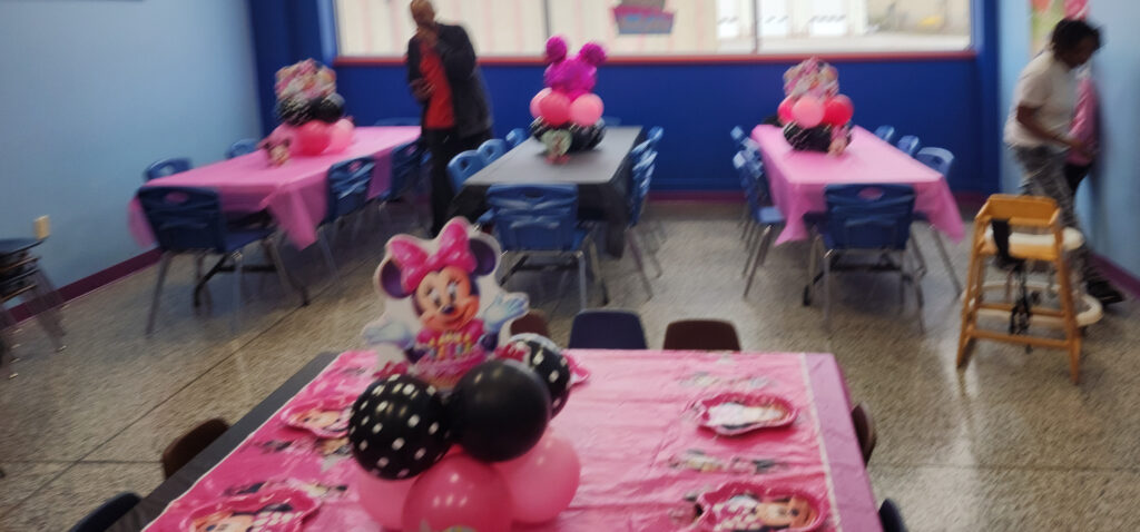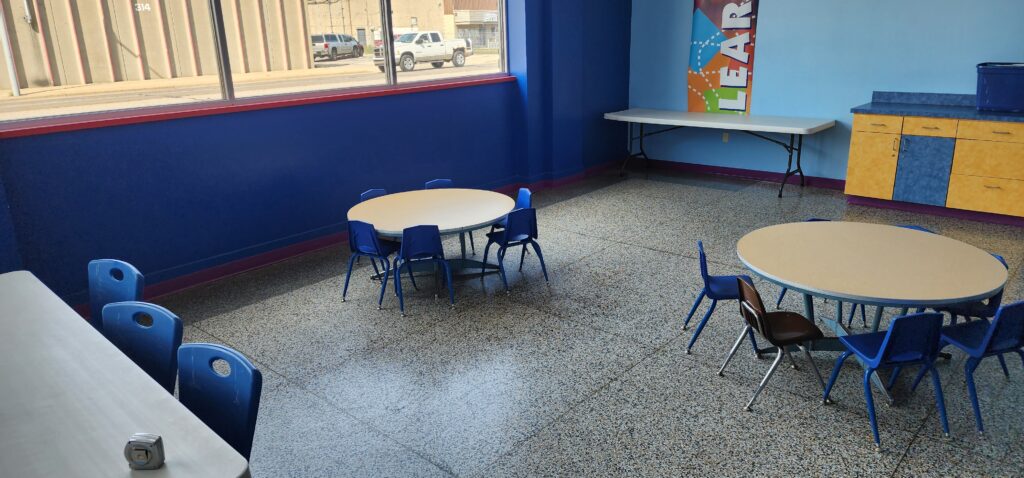 Room 3 is our mid-sized room, lots of kid seating, great window light, has a sink. Seats around 27 adults and 22 children.