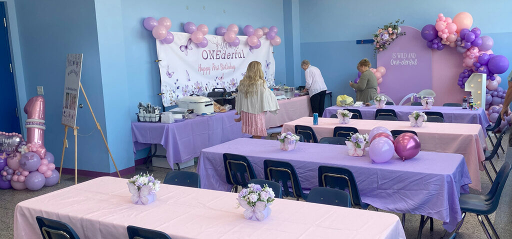 This is our smallest room. Great window lighting, lots of big tables, closest to the lobby. Has a sink. Seats around 24 adults and 16 children.